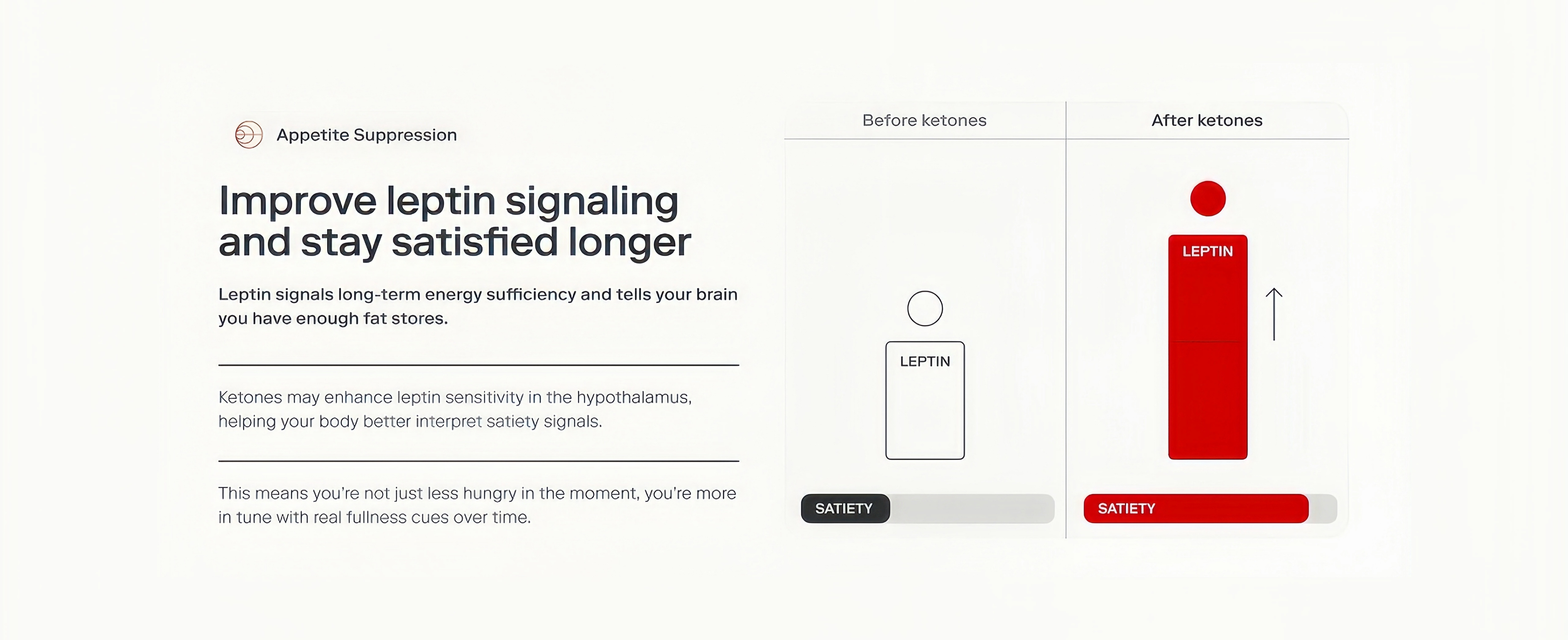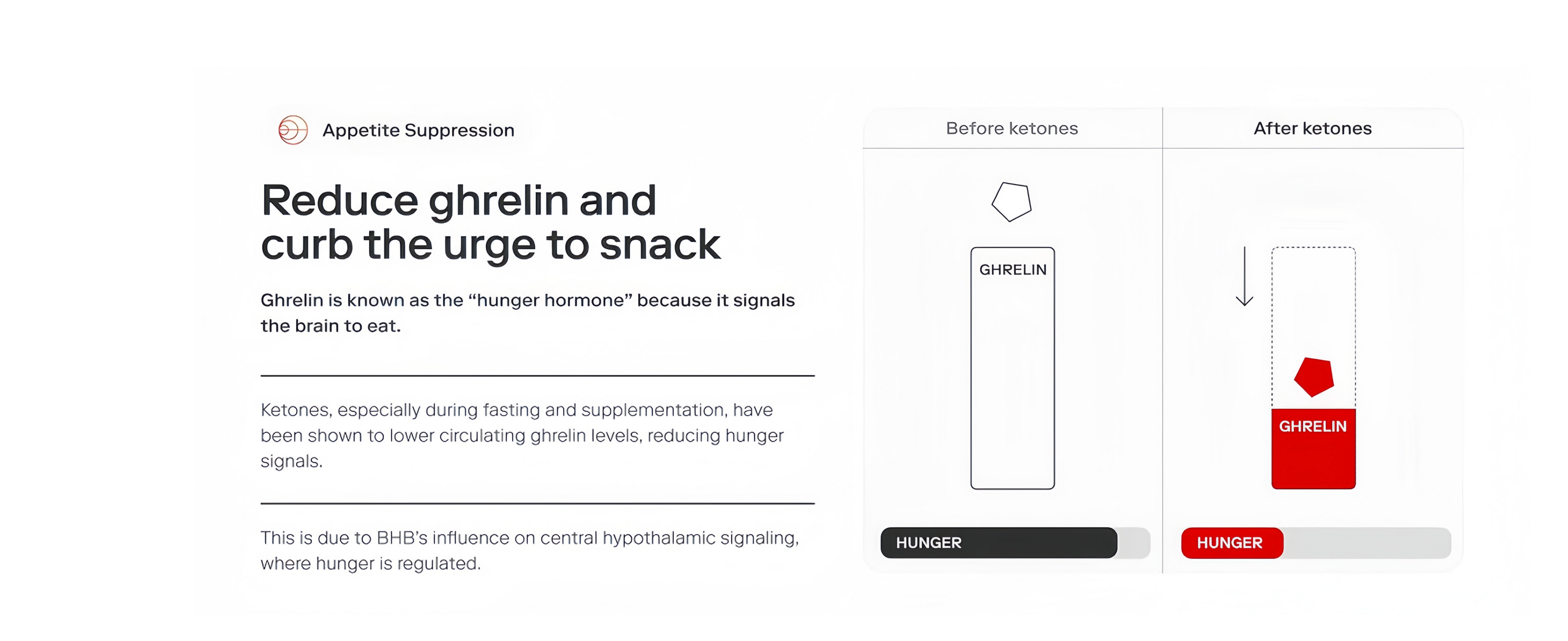- Metabolic Health and Appetite: Ketones, and raising your blood ketone levels, have been shown to significantly reduce ghrelin (1), the hunger hormone. A reduced appetite makes it easier to maintain a calorie deficit and achieve and manage a healthy weight!*